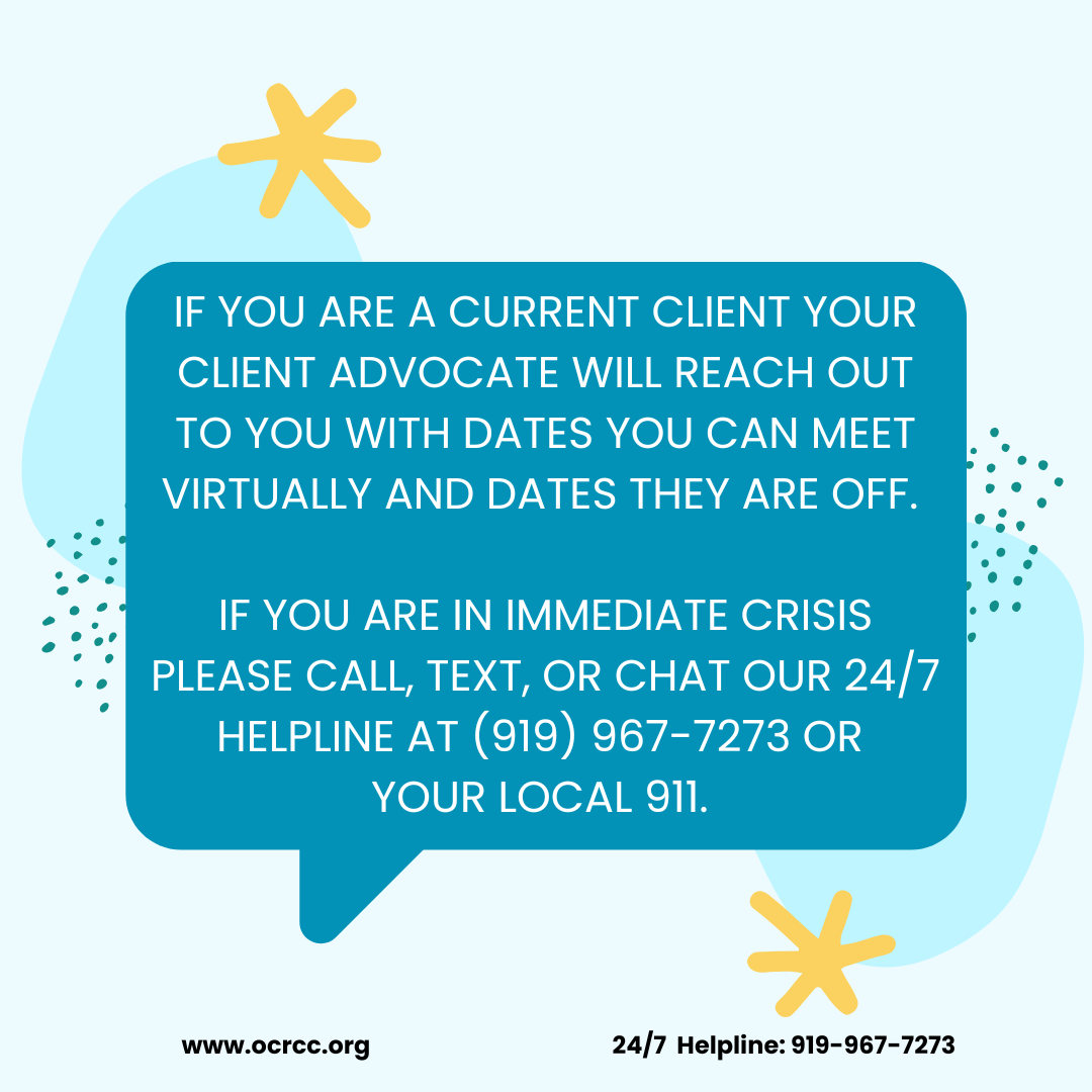 If you are a current client, your client advocate will reach out to you with dates they can meet with you and dates they are off. If you are in immediate crisis please call, text, or chat our 24/7 helpline at (919) 967-7273 or your local 911.