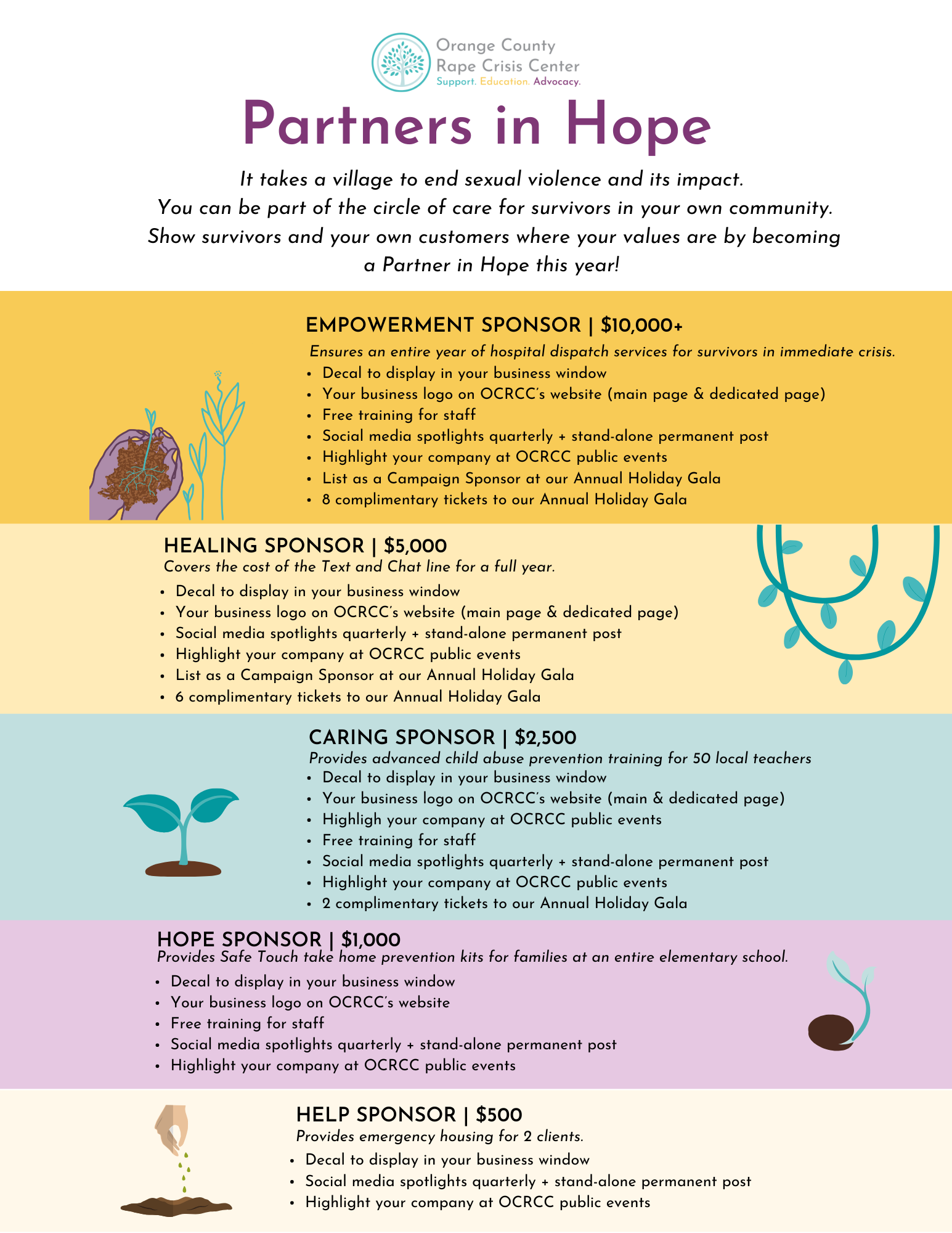 It takes a village to end sexual violence and its impact. You can be part of the circle of care for survivors in your own community. Show survivors and your own customers where your values are by becoming a Partner in Hope this year!